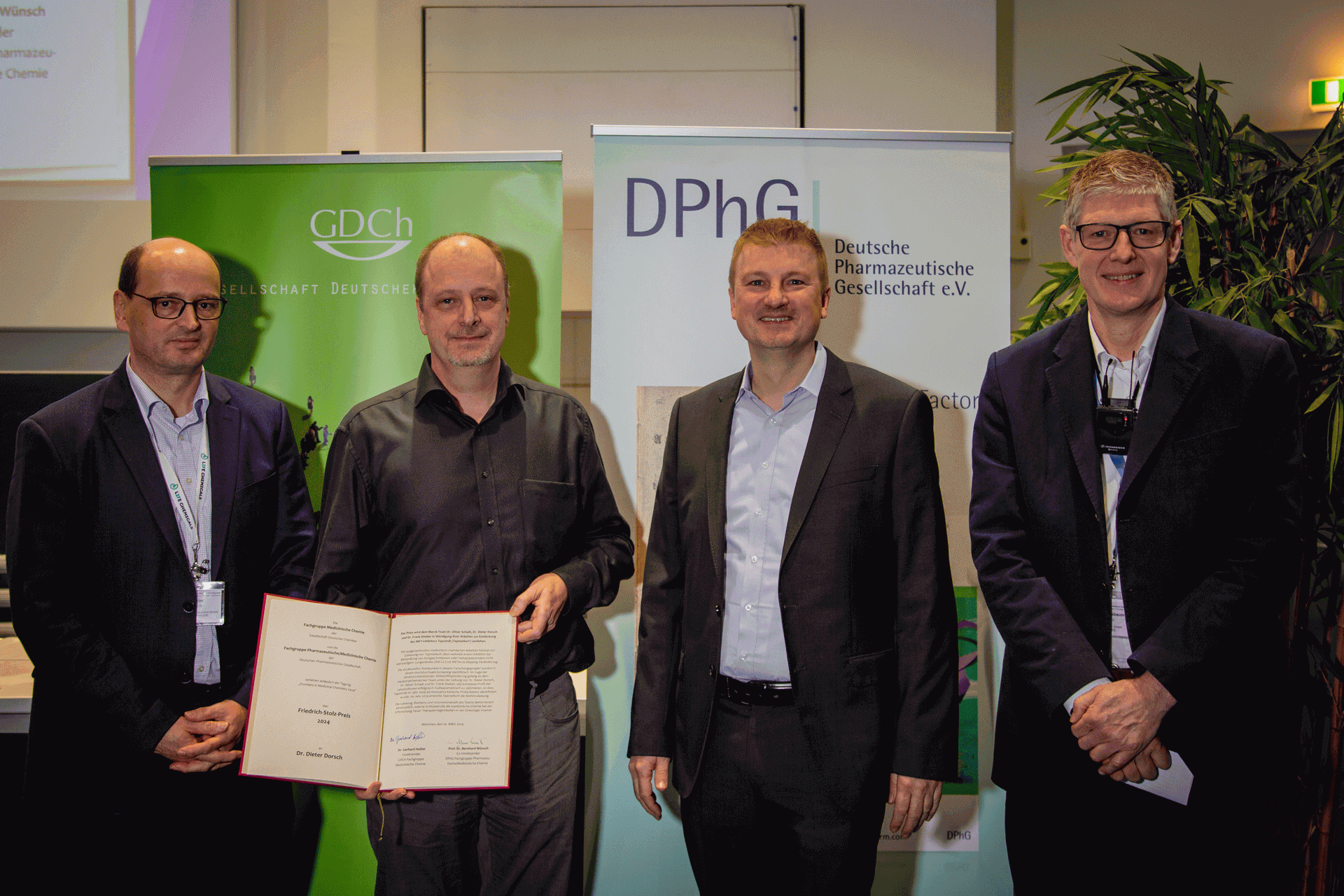 Preiskomitee 2024: Dr. Gerhard Heßler (GDCh), Dr. Tatjana Ross (GDCh), Prof. Dr. Stefan Laufer (DPhG), Prof. Dr. Bernhard Wünsch (DPhG), Dr. Franz von Nussbaum (extern; Vorsitz) und Prof. Dr. Christa Müller (extern)