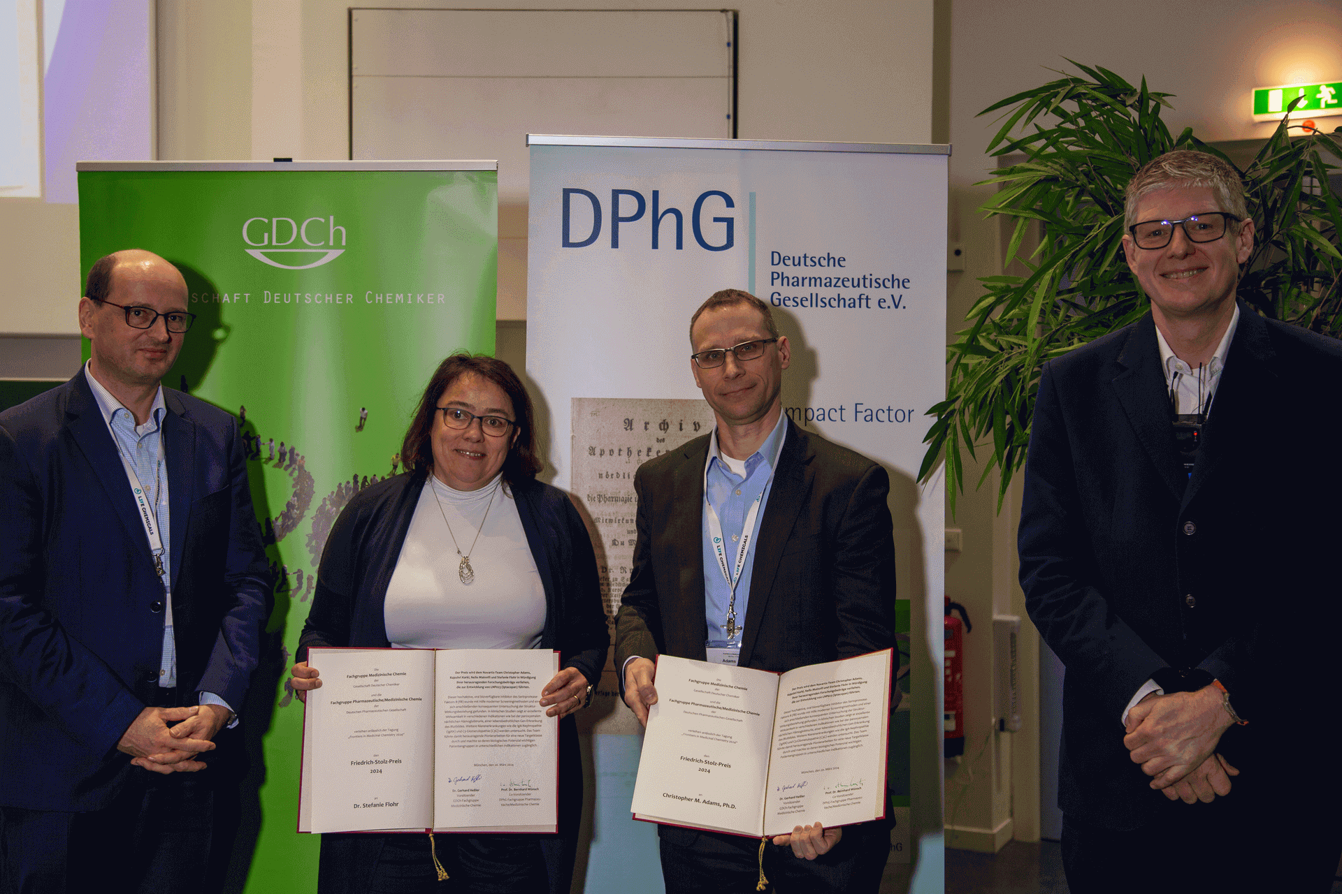 Anlässlich der Tagung Frontiers in Medicinial Chemistry 2024 in München wurde das Novartis-Team Christopher Adams, Rajeshri Karki, Nello Mainolfi und Stefanie Flohr in Würdigung ihrer herausragenden Forschungsbeiträge, die zur Entwicklung von LNP023 (Iptacopan) führten, sowie das Merck-Team Dr. Oliver Schadt, Dr. Dieter Dorsch und Dr. Frank Stieber in Würdigung ihrer Arbeiten zur Entdeckung des MET-Inhibitors Tepotinib mit dem Friedrich-Stolz-Preis 2024 ausgezeichnet.