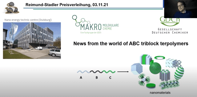 Am 3. November 2021 wurde die ursprünglich für das Jahr 2020 geplante Verleihung des Reimund-Stadler-Preises 2020 an Prof. Dr. André Gröschel (Westfälische Wilhelms-Universität Münster) im Rahmen eines Online-Symposiums nachgeholt. Im Anschluss an die Verleihung gab André Gröschel Einblicke in seine Forschung rund um das Thema "News from the world of ABC Triblock Terpolymers".