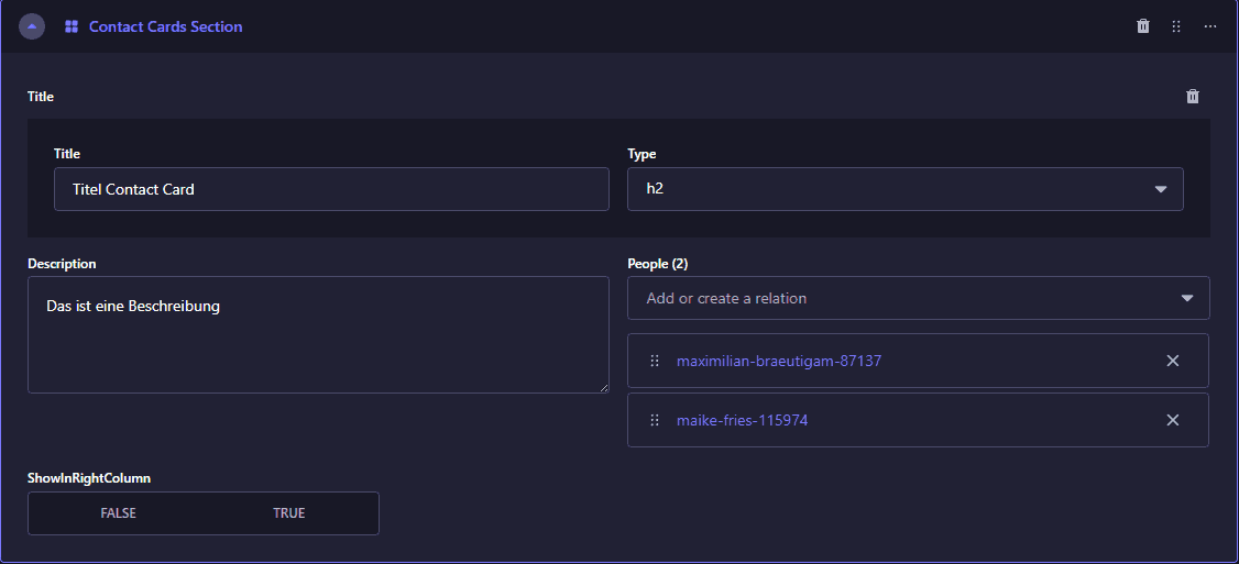 Die einfachste Form eines Inhaltselements ist „Text with Image“. Das wird in 90% der Fälle verwendet werden, weil es sehr gut mit dem dreispaltigen Layout auf dem Desktop funktioniert und Basisfunktionalität für die Darstellung von Texten liefert. Es können ein Icon, Titel, Bilder, Buttons und Zugriffsberechtigungen festgelegt werden.