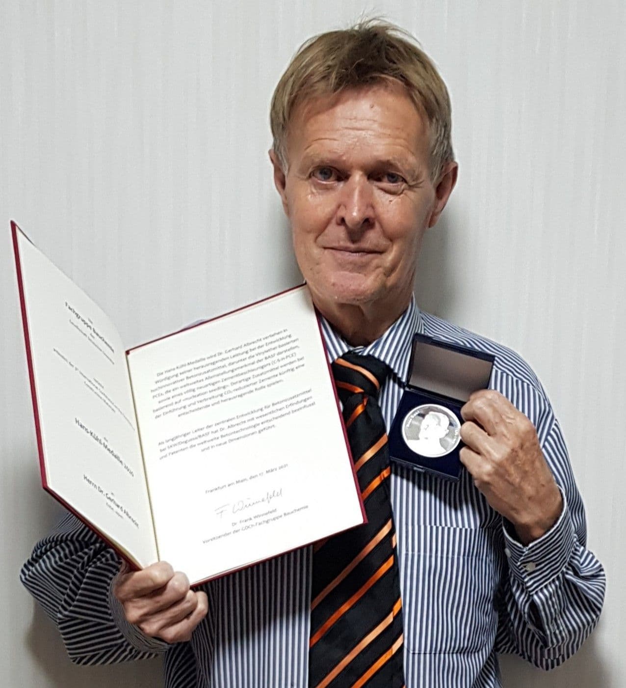 Die Hans-Kühl-Medaille wird Dr. Gerhard Albrecht (Kobe, Japan) verliehen in Würdigung seiner herausragenden Leistung bei der Entwicklung hochinnovativer Betonzusatzmittel, darunter die Vinylether-basierten PCEs, die ein weltweites Alleinstellungsmerkmal der BASF darstellen, sowie eines völlig neuartigen Zementbeschleunigers (C-S-H-PCE) basierend auf «nucleation seeding». Derartige Zusatzmittel werden bei der Einführung und Verbreitung CO2-reduzierter Zemente künftig eine entscheidende und herausragende Rolle spielen. Als langjähriger Leiter der zentralen Entwicklung für Betonzusatzmittel bei SKW/Degussa/BASF hat Dr. Albrecht mit wesentlichen Erfindungen und Patenten die weltweite Betontechnologie entscheidend beeinflusst und in neue Dimensionen geführt.