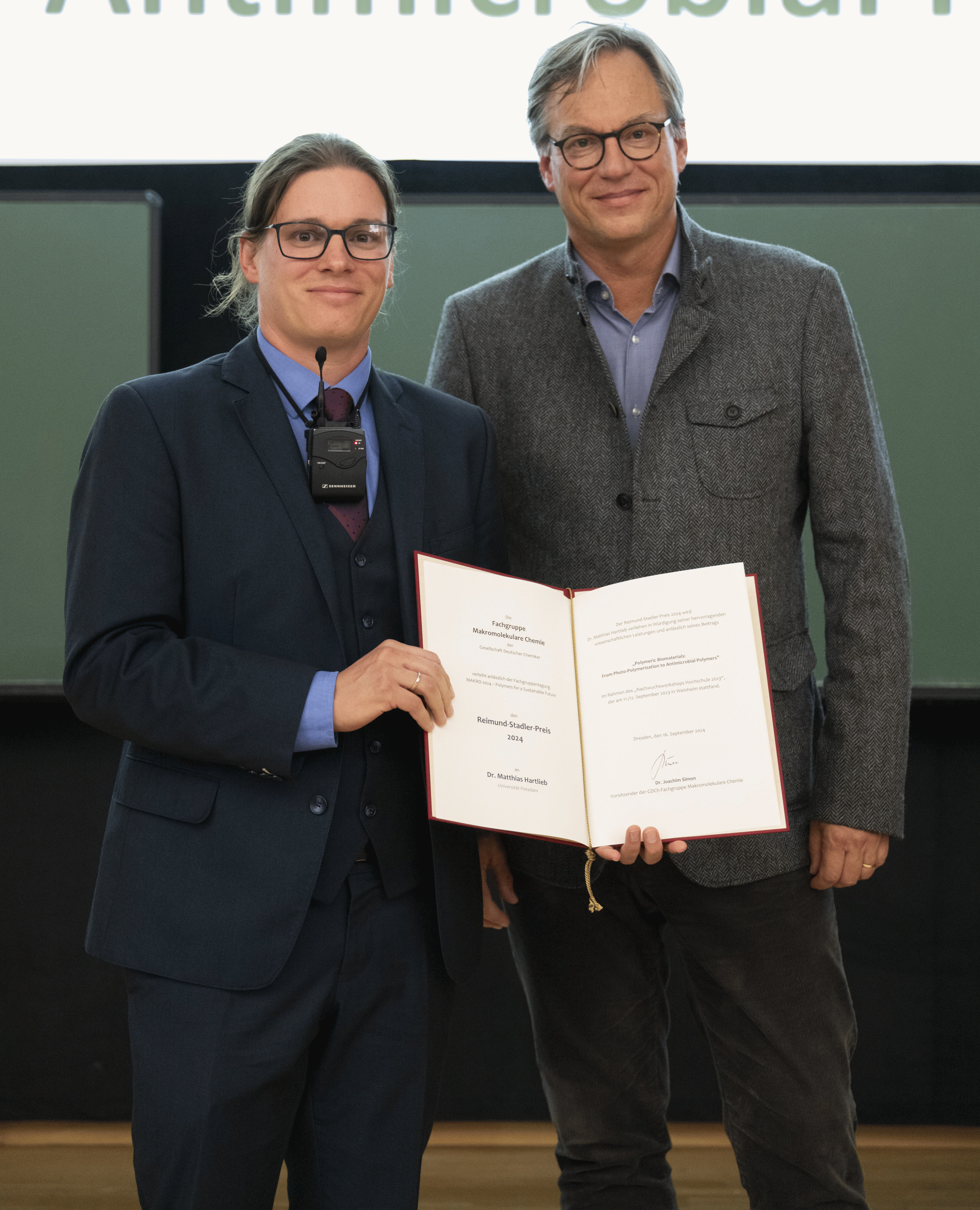 Der Reimund-Stadler-Preis 2024 wurde am 16. September 2024 anlässlich der Fachgruppentagung "MAKRO 2024 – Polymers for a Sustainable Future" in Dresden an Dr. Matthias Hartlieb (Universität Potsdam) verliehen: "in Würdigung seiner hervorragenden wissenschaftlichen Leistungen und anlässlich seines Beitrags Polymeric Biomaterials: From Photo-Polymerization to Antimicrobial Polymers” im Rahmen des Nachwuchsworkshops Hochschule 2023 der Fachgruppe Makromolekulare Chemie, der am 11./12. September 2023 bei Freudenberg in Weinheim stattfand."
