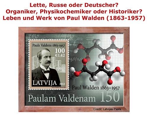 In den Vorlesungen zur Organischen Chemie werden nukleophile Substitutionsreaktionen erster und zweiter Ordnung besprochen. Wenn die Substitution zweiter Ordnung an einem Kohlenstoffatom stattfindet, das ein stereogenes Zentrum ist, wird die Konfiguration umgekehrt, was gern durch das Umklappen eines Regenschirms beschrieben wird. Dieses Phänomen ist in die Literatur als Walden-Umkehr eingegangen, weil sie von dem Gelehrten Paul Walden erstmals beschrieben wurde. Sein Hauptarbeitsgebiet war aber die physikalische Chemie, gelegentlich wird er sogar als Vater der Ionischen Flüssigkeiten gefeiert. Doch auch in der Geschichte der Chemie trifft man auf den Namen Walden, der seine Herkunft aus einer lettischen Bauernfamilie verschwiegen und sich als Baltendeutscher dargestellt hat. Neben einer Würdigung seiner Leistungen in der Chemie und einer kritischen Betrachtung seiner historischen Beiträge wird die Biografie dieses Chemikers vorgestellt, der das zaristische Russland, kurzzeitig das unabhängige Lettland, Deutschland in der Weimarer Republik und im Nationalsozialismus und schließlich die Bundesrepublik Deutschland erlebte.