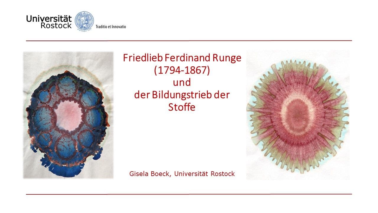 Haben Sie schon einmal das Buch Der Bildungstrieb der Stoffe von Runge in der Hand gehabt? Sie werden beeindruckt von den Bildern sein, bei denen man sich teilweise sogar Abbildungen der Natur vorstellen kann. Doch im Grunde sind sie nichts anderes als das Produkt einer chemischen Reaktion, bei der unterschiedliche Lösungen auf Löschpapier getropft worden waren. Damit hatte Runge einen Vorläufer der Chromatografie entwickelt. Doch ihn interessierte in diesem Zusammenhang auch die Frage, ob hinter diesen Bildern nicht in Analogie zur Lebenskraft (vis vitalis) eine Kraft der Natur stecke. Im Vortrag wird es möglich sein, sich anhand einiger Aufnahmen aus der in Rostock vorhandenen Originalausgabe zu erfreuen, aber auch den Lebensweg von Runge, seine bedeutenden Entdeckungen (Coffein, Chinin, Anilin, Karbolsäure, Pyrrol) kennenzulernen sowie Passagen aus seinen "Hauswirthschaftlichen Briefen" zu hören.