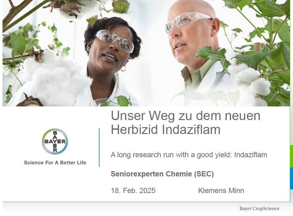 Aus Sicht eines beteiligten Laborleiters wird der Hintergrund und die entscheidenden Schritte bei der Entwicklung und im Weiteren die wichtigsten Merkmale des Herbizides Indaziflam vorgestellt: Hintergrund, Optimierung der herbiziden Wirksamkeit, Inibierung der Cellulose-Biosynthese, Chemische Synthese, Herbizid-Profil und Anwendung in der Landwirtschaft.