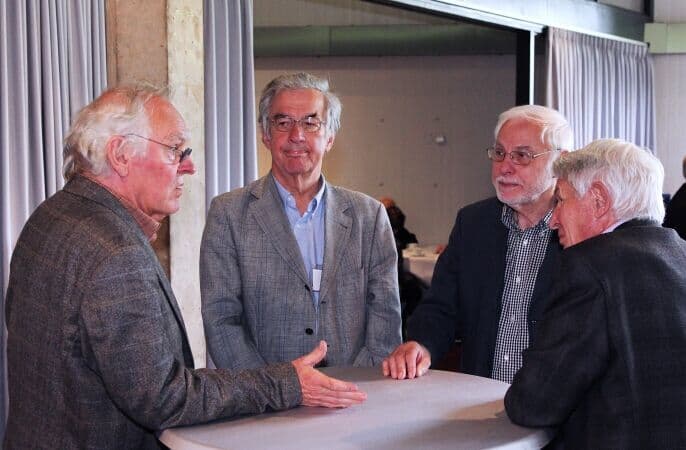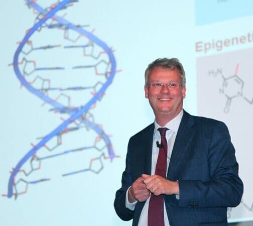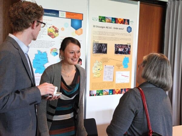 In der folgenden Kaffeepause kam es an den 18 Postern zu regen Diskussionen zwischen Jung und Alt. Die Themen spannten einen weiten Bogen von Chemie in der Schule, chemiehistorischen Betrachtungen bis zu aktuellen Forschungsarbeiten aus dem Bereich der Biochemie. Zurück im Vortragsraum lauschte das Auditorium dem spannenden Vortrag von Thomas Carell. Massenspektrometrische Analyse und Synthese isotopenmarkierter seltener DNA-Basen, jenseits von Watson und Crick, sowie ihre mögliche Bedeutung in der Epigenetik und Entwicklung von Stammzellen wurden vorgestellt und in einer regen Diskussion erörtert. „Biomineralisierung“ war das Thema im Vortrag von Rüdiger Kniep. Die faszinierende Beobachtung, dass aus einfachen „Zutaten“ wie Gelatine und wässrigen Ionenlösungen selbstorganisiert Biominerale gebildet werden, zeigte er z.B. am Aufbau Calcit-basierter Otoconien des Innenohrs.