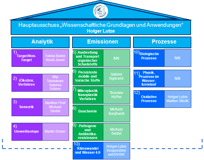 Ein Querschnittsthema stellt der Fachausschuss Wasser 4.0 und Klimawandel dar (FA13), der alle drei Bereiche (Analytik, Emissionen und Prozesse) integriert. Hier werden die Auswirkungen von Extremereignissen und die wasserwirtschaftlichen Anforderungen der Zukunft (Verfügbarkeit und Qualität von Ressourcen) auf die Wasserversorgung mittels digitaler Abbildungen (z.B. virtueller Zwilling) im Bereich der Wassergewinnung, Aufbereitung und Verteilung abgeschätzt. Hiermit sollen Handlungsstrategien zur zukünftigen Sicherung einer ausreichenden Versorgung mit qualitativ hochwertigem Trinkwasser abgeleitet werden.