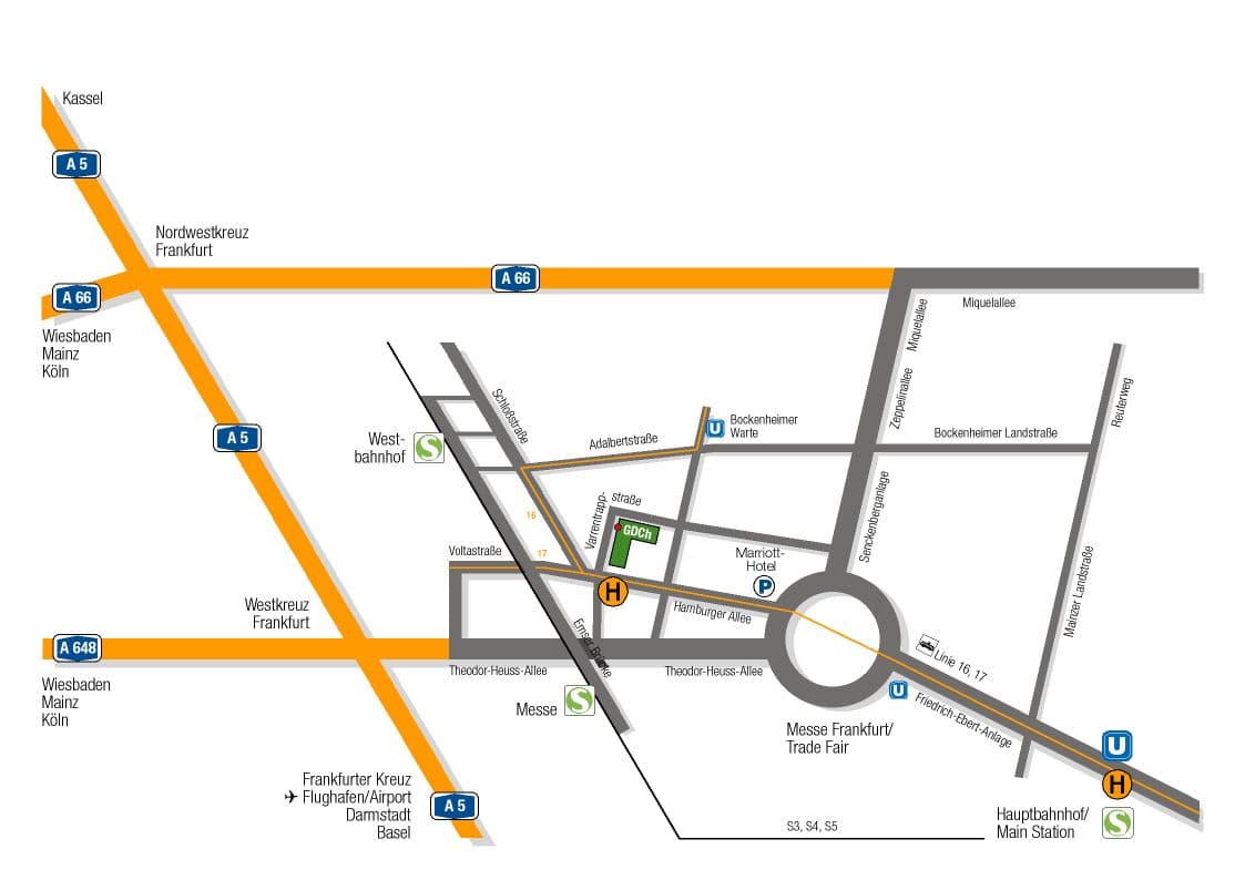 Ab Hauptbahnhof mit Straßenbahn Linie 16 (Richtung Ginnheim) oder Linie 17 (Richtung Rebstockbad) 5 Stationen. Haltestelle Varrentrappstraße. Oder zu Fuß ca. 20 Min.